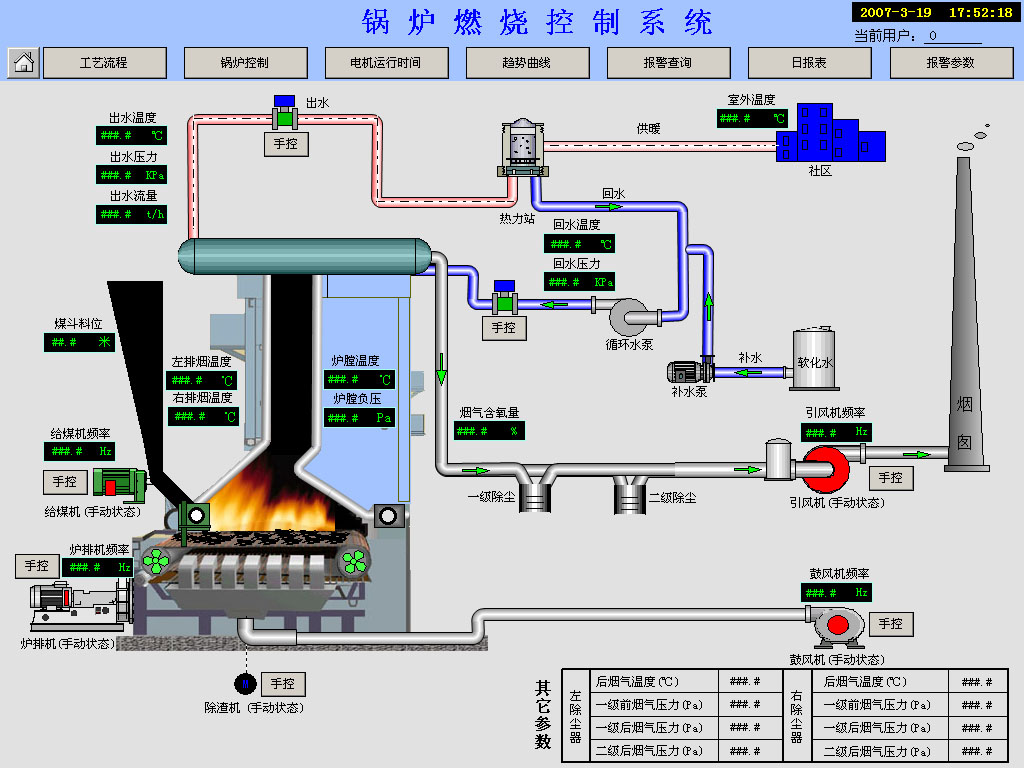 1 ) 温度: 每台炉的炉膛温度、 一级省煤器进口烟温、 一级省煤器出口烟温、 二级省煤器出口烟温、 空预器出口左侧烟温、 空预器出口右侧烟温、 引风机出口烟温、 鼓风机出口冷风温度、 预热器出口热风温度; 热水锅炉的锅炉热水出口温度、 回水温度、 热水总管温度; 水处理部分的除氧罐水温等。